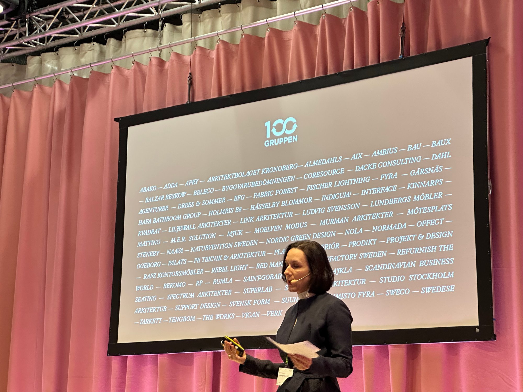 100 Grupa je osnovana zahvaljujući kolegama iz LINK-a, gde su enterijeristi tražili pomoć u radu sa izborom održivih proizvoda u enterijerima. LINK je arhitektonska firma u kojoj sam takođe radila kao šef održivosti, pre Tengboma. U severnim zemljama ljudi provode 85–90% vremena u zatvorenom prostoru, a nedostaju jasni kriterijumi za rad sa održivim enterijerima. U saradnji sa jednim kolegom iz švedske konsultantske firme WSP organizovali smo seminar 2015. godine, gde su svih 100 mesta bila popunjena. Zahvaljujući velikom interesovanju kolega iz branše, vrlo brzo smo osnovali nevladinu organizaciju (uobičajen oblik organizovanja raznih inicijativa u Švedskoj), i danas imamo 70 kompanija iz celog lanca vrednosti industrije koje su članice. Bavimo se razvojem digitalnih standarda i sistema, kao i podržavanjem članica u razvoju ekološki i klimatski prihvatljivih proizvoda i usluga, kao i tranziciji ka cirkularnoj ekonomiji. Mislim da je ključ uspeha u Švedskoj način poslovanja – kao samoorganizovana nevladina organizacija, u kojoj postoje veoma jasna pravila ponašanja i poslovanja.