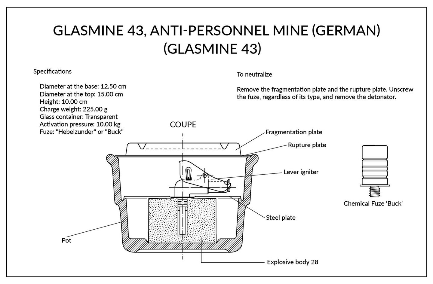 The Glasmine 43, later renamed the Schützen-Küstenmine, was an innovative German antipersonnel mine developed during World War II. Its design utilized glass as the primary material, addressing wartime resource shortages while providing a mine that was undetectable by early metal detectors. The mine was versatile, suitable for both land-based and underwater deployment, and saw widespread use during the later stages of the war.